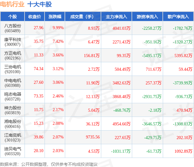 个股表现方面,电机行业当日领涨股为八方股份(603489),该股当日报收27.96,上涨9.99%,成交量8.93万,主力资金净流入4041.03万元。康平科技(300907)以上涨7.42%紧随其后,该股当日成交量6.47万,主力资金净流入2271.43万元。除此之外,方正电机(002196)、三协电机(920100)、中电电机(603988)均进入当日牛股之列。具体个股列表见下表: