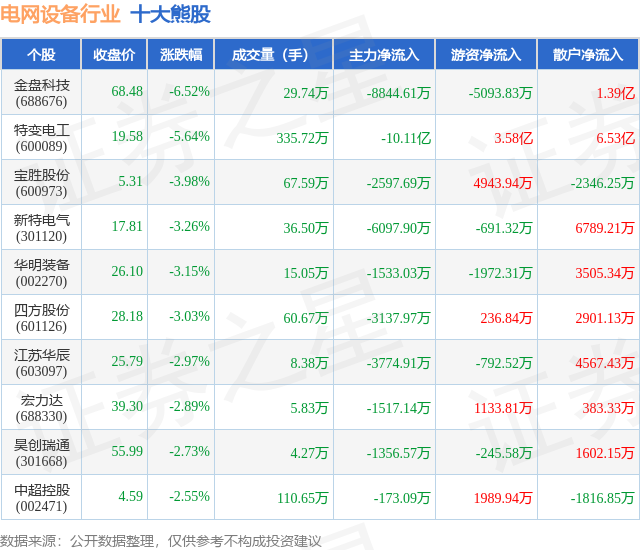 个股表现方面,电网设备行业当日领跌股为金盘科技(688676),该股当日报收68.48,下跌6.52%,成交量29.74万,主力资金净流出8844.61万元。特变电工(600089)以下跌5.64%紧随其后,该股当日成交量335.72万,主力资金净流出10.11亿元。除此之外,宝胜股份(600973)、新特电气(301120)、华明装备(002270)均进入当日熊股之列。具体个股列表见下表: