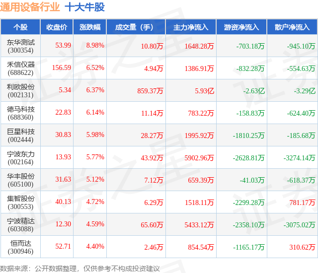 个股表现方面,通用设备行业当日领涨股为东华测试(300354),该股当日报收53.99,上涨8.98%,成交量10.8万,主力资金净流入1648.28万元。禾信仪器(688622)以上涨6.52%紧随其后,该股当日成交量4.94万,主力资金净流入1386.91万元。除此之外,利欧股份(002131)、德马科技(688360)、巨星科技(002444)均进入当日牛股之列。具体个股列表见下表: