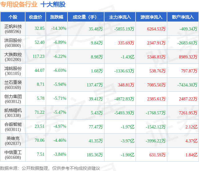 个股表现方面,专用设备行业当日领跌股为正帆科技(688596),该股当日报收32.85,下跌14.3%,成交量35.48万,主力资金净流出5855.19万元。洪田股份(603800)以下跌6.89%紧随其后,该股当日成交量9.84万,主力资金净流入335.69万元。除此之外,大族数控(301200)、鸿铭股份(301105)、兰石重装(603169)均进入当日熊股之列。具体个股列表见下表: