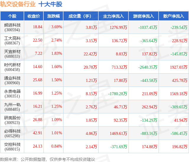 个股表现方面,轨交设备行业当日领涨股为朗进科技(300594),该股当日报收18.84,上涨3.69%,成交量3.81万,主力资金净流入1276.99万元。工大高科(688367)以上涨2.74%紧随其后,该股当日成交量3.15万,主力资金净流入136.72万元。除此之外,天宜新材(688033)、时代新材(600458)、通业科技(300960)均进入当日牛股之列。具体个股列表见下表: