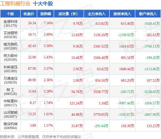 个股表现方面,工程机械行业当日领涨股为金道科技(301279),该股当日报收26.34,上涨7.16%,成交量9.78万,主力资金净流入413.02万元。艾迪精密(603638)以上涨5.89%紧随其后,该股当日成交量12.69万,主力资金净流入1136.29万元。除此之外,南方路机(603280)、同力股份(920599)、长龄液压(605389)均进入当日牛股之列。具体个股列表见下表: