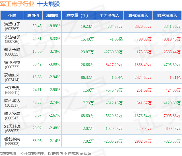 个股表现方面,军工电子行业当日领跌股为鸿远电子(603267),该股当日报收50.45,下跌9.89%,成交量19.23万,主力资金净流出4784.77万元。宏达电子(300726)以下跌5.33%紧随其后,该股当日成交量15.49万,主力资金净流出1.06亿元。除此之外,航天长峰(600855)、振华科技(000733)、高德红外(002414)均进入当日熊股之列。具体个股列表见下表: