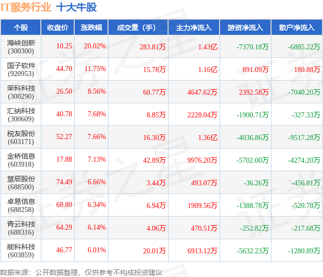个股表现方面,IT服务行业当日领涨股为海峡创新(300300),该股当日报收10.25,上涨20.02%,成交量283.81万,主力资金净流入1.43亿元。国子软件(920953)以上涨11.75%紧随其后,该股当日成交量15.78万,主力资金净流入1.16亿元。除此之外,荣科科技(300290)、汇纳科技(300609)、税友股份(603171)均进入当日牛股之列。具体个股列表见下表: