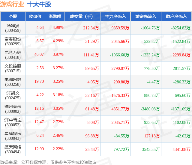 个股表现方面,游戏行业当日领涨股为汤姆猫(300459),该股当日报收4.64,上涨4.98%,成交量212.34万,主力资金净流入9859.59万元。富春股份(300299)以上涨4.29%紧随其后,该股当日成交量31.29万,主力资金净流入2045.66万元。除此之外,昆仑万维(300418)、文投控股(600715)、电魂网络(603258)均进入当日牛股之列。具体个股列表见下表: