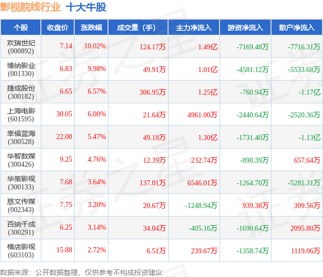 个股表现方面,影视院线行业当日领涨股为欢瑞世纪(000892),该股当日报收7.14,上涨10.02%,成交量124.17万,主力资金净流入1.49亿元。博纳影业(001330)以上涨9.98%紧随其后,该股当日成交量49.91万,主力资金净流入1.01亿元。除此之外,捷成股份(300182)、上海电影(601595)、幸福蓝海(300528)均进入当日牛股之列。具体个股列表见下表: