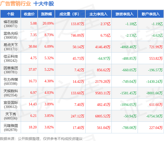 个股表现方面,广告营销行业当日领涨股为福石控股(300071),该股当日报收5.08,上涨20.09%,成交量133.87万,主力资金净流入2.37亿元。蓝色光标(300058)以上涨8.73%紧随其后,该股当日成交量746.09万,主力资金净流入6.75亿元。除此之外,易点天下(301171)、佳云科技(300242)、因赛集团(300781)均进入当日牛股之列。具体个股列表见下表: