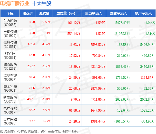 个股表现方面,电视广播行业当日领涨股为东方明珠(600637),该股当日报收9.7,上涨5.66%,成交量161.12万,主力资金净流入1.59亿元。吉视传媒(601929)以上涨5.11%紧随其后,该股当日成交量559.14万,主力资金净流入1.52亿元。除此之外,无线传媒(301551)、ST广网(600831)、海看股份(301262)均进入当日牛股之列。具体个股列表见下表: