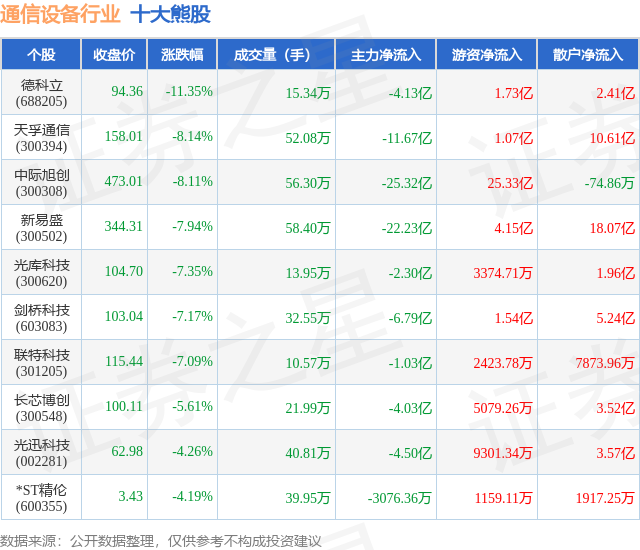 个股表现方面,通信设备行业当日领跌股为德科立(688205),该股当日报收94.36,下跌11.35%,成交量15.34万,主力资金净流出4.13亿元。天孚通信(300394)以下跌8.14%紧随其后,该股当日成交量52.08万,主力资金净流出11.67亿元。除此之外,中际旭创(300308)、新易盛(300502)、光库科技(300620)均进入当日熊股之列。具体个股列表见下表: