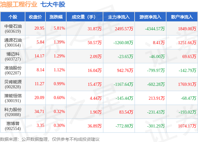 个股表现方面,油服工程行业当日领涨股为中曼石油(603619),该股当日报收20.95,上涨5.81%,成交量31.87万,主力资金净流入2495.57万元。通源石油(300164)以上涨1.39%紧随其后,该股当日成交量50.57万,主力资金净流出1260.08万元。除此之外,博迈科(603727)、准油股份(002207)、贝肯能源(002828)均进入当日牛股之列。具体个股列表见下表:
