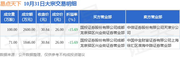 证券之星消息,10月31日易点天下发生大宗交易,交易数据如下: