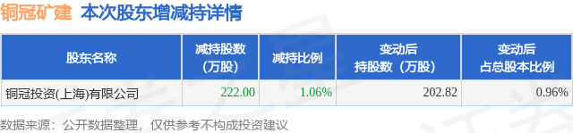 证券之星消息,10月31日铜冠矿建发布公告《铜冠矿建:关于控股股东及其一致行动人权益变动触及1%整倍数的提示性公告》,其股东铜冠投资(上海)有限公司于2025年7月21日至2025年10月30日间合计减持222.0万股,占公司目前总股本的1.0558%,变动期间该股股价下跌11.26%,截止10月30日收盘报21.76元。