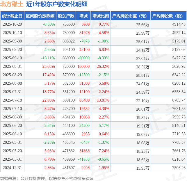 从股价来看,2025年10月10日至2025年10月20日,北方稀土区间跌幅为0.5%,在此期间股东户数增加5600.0户,增幅为0.77%。