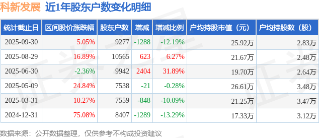 从股价来看,2025年8月29日至2025年9月30日,科新发展区间涨幅为5.05%,在此期间股东户数减少1288.0户,减幅为12.19%。