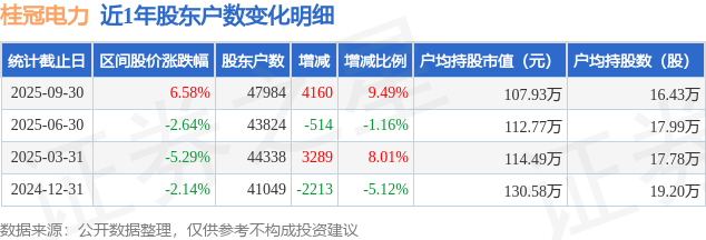 从股价来看,2025年6月30日至2025年9月30日,桂冠电力区间涨幅为6.58%,在此期间股东户数增加4160.0户,增幅为9.49%。