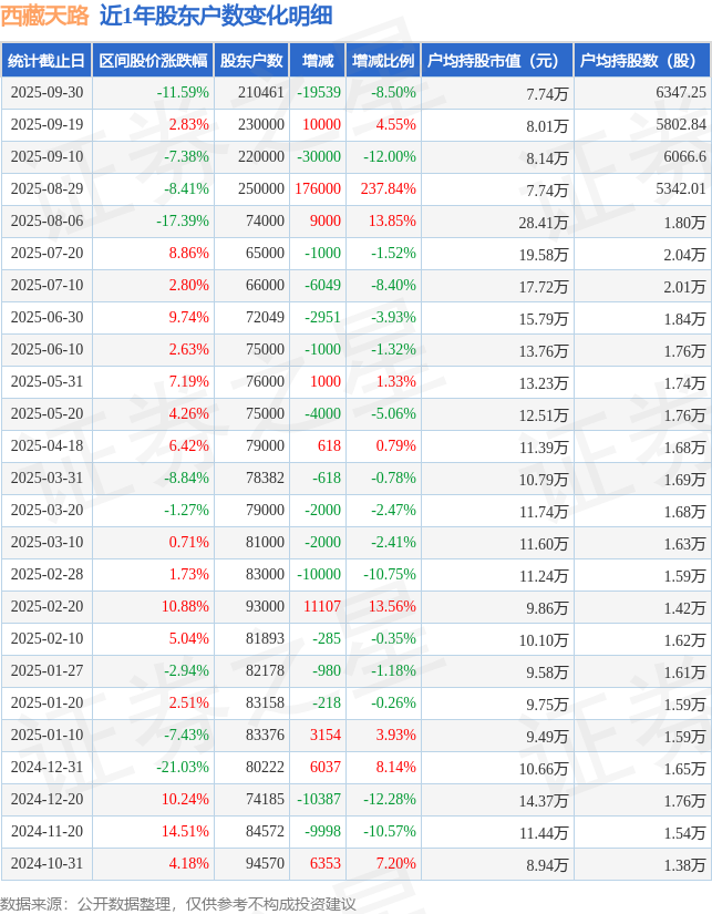 从股价来看,2025年9月19日至2025年9月30日,西藏天路区间跌幅为11.59%,在此期间股东户数减少1.95万户,减幅为8.5%。