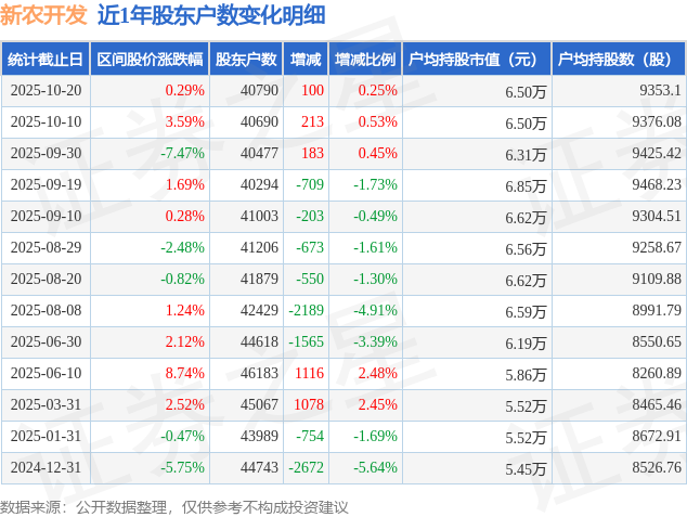 从股价来看,2025年10月10日至2025年10月20日,新农开发区间涨幅为0.29%,在此期间股东户数增加100.0户,增幅为0.25%。