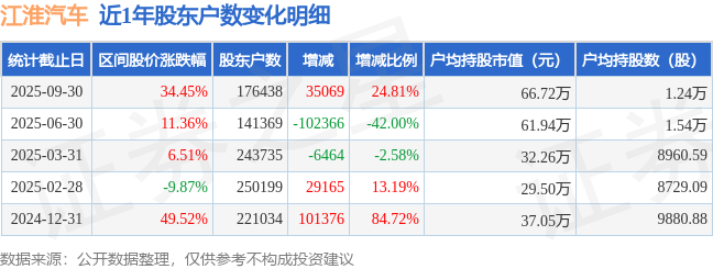从股价来看,2025年6月30日至2025年9月30日,江淮汽车区间涨幅为34.45%,在此期间股东户数增加3.51万户,增幅为24.81%。