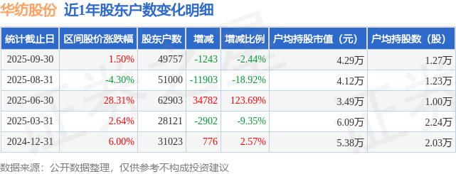 从股价来看,2025年8月31日至2025年9月30日,华纺股份区间涨幅为1.5%,在此期间股东户数减少1243.0户,减幅为2.44%。