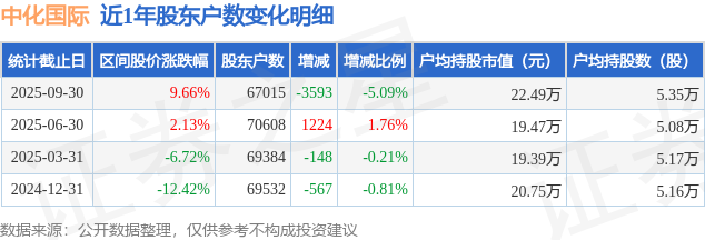 从股价来看,2025年6月30日至2025年9月30日,中化国际区间涨幅为9.66%,在此期间股东户数减少3593.0户,减幅为5.09%。