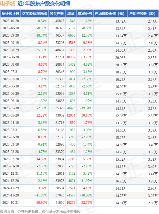 从股价来看,2025年10月10日至2025年10月20日,电子城区间跌幅为0.54%,在此期间股东户数减少548.0户,减幅为1.18%。
