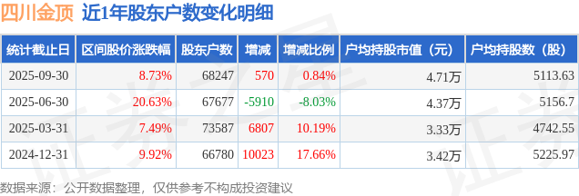 从股价来看,2025年6月30日至2025年9月30日,四川金顶区间涨幅为8.73%,在此期间股东户数增加570.0户,增幅为0.84%。