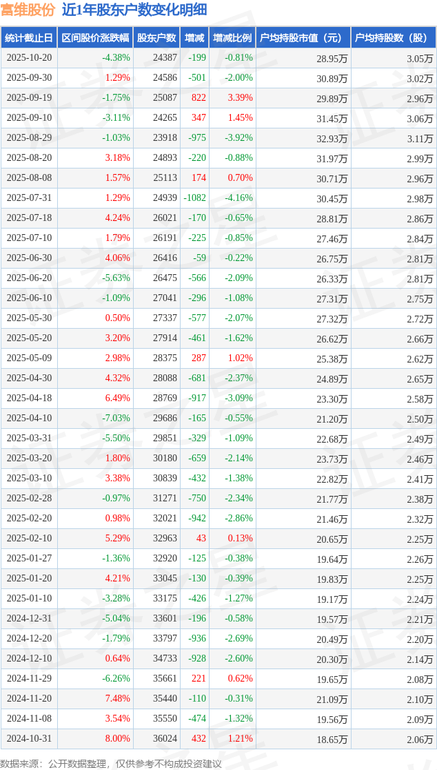 从股价来看,2025年9月30日至2025年10月20日,富维股份区间跌幅为4.38%,在此期间股东户数减少199.0户,减幅为0.81%。