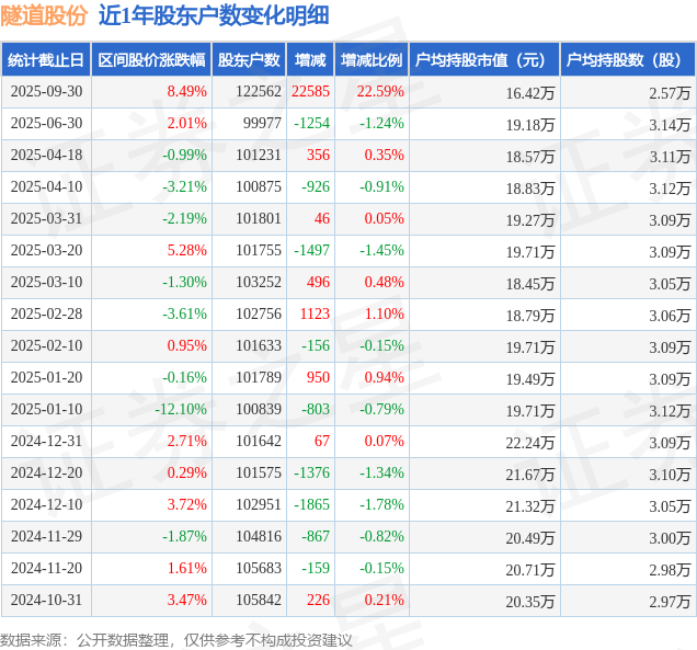 从股价来看,2025年6月30日至2025年9月30日,隧道股份区间涨幅为8.49%,在此期间股东户数增加2.26万户,增幅为22.59%。