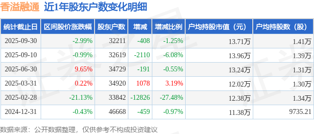 从股价来看,2025年9月10日至2025年9月30日,香溢融通区间跌幅为2.99%,在此期间股东户数减少408.0户,减幅为1.25%。