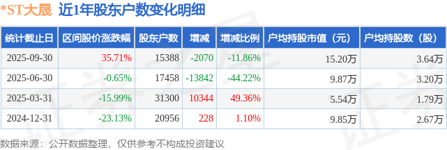 从股价来看,2025年6月30日至2025年9月30日,*ST大晟区间涨幅为35.71%,在此期间股东户数减少2070.0户,减幅为11.86%。