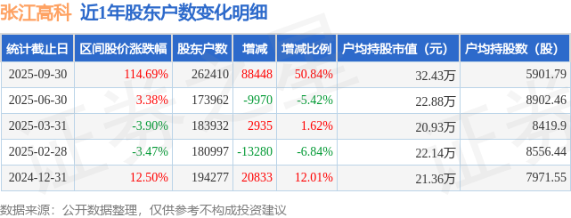 从股价来看,2025年6月30日至2025年9月30日,张江高科区间涨幅为114.69%,在此期间股东户数增加8.84万户,增幅为50.84%。