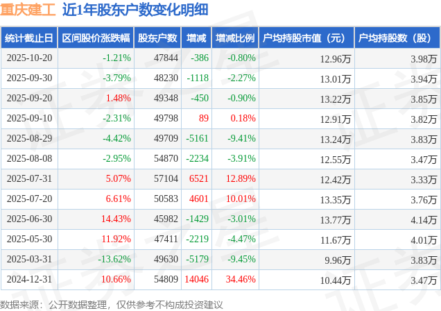 从股价来看,2025年9月30日至2025年10月20日,重庆建工区间跌幅为1.21%,在此期间股东户数减少386.0户,减幅为0.8%。