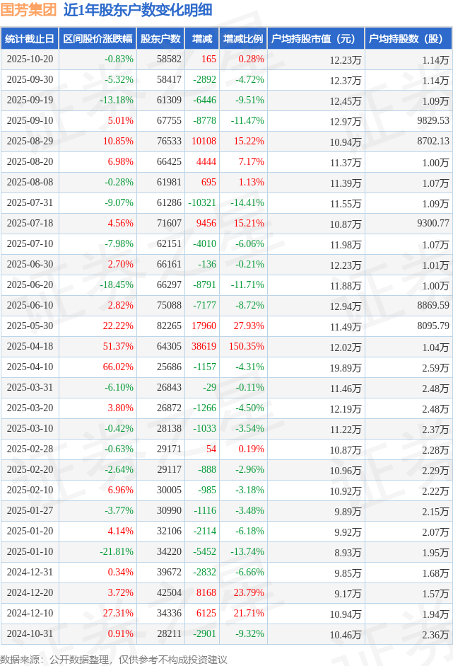 从股价来看,2025年9月30日至2025年10月20日,国芳集团区间跌幅为0.83%,在此期间股东户数增加165.0户,增幅为0.28%。