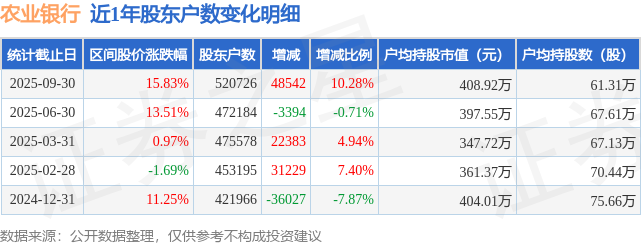 从股价来看,2025年6月30日至2025年9月30日,农业银行区间涨幅为15.83%,在此期间股东户数增加4.85万户,增幅为10.28%。