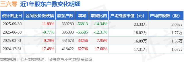 从股价来看,2025年6月30日至2025年9月30日,三六零区间涨幅为11.89%,在此期间股东户数减少5.68万户,减幅为14.34%。