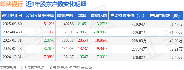 从股价来看,2025年6月30日至2025年9月30日,邮储银行区间涨幅为5.12%,在此期间股东户数减少2.15万户,减幅为13.27%。