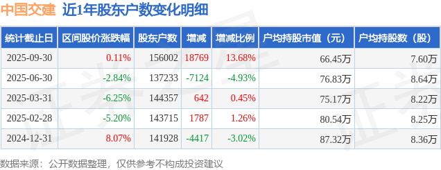 证券之星消息,近日中国交建披露,截至2025年9月30日公司股东户数为15.6万户,较6月30日增加1.88万户,增幅为13.68%。户均持股数量由上期的8.64万股减少至7.6万股,户均持股市值为66.45万元。