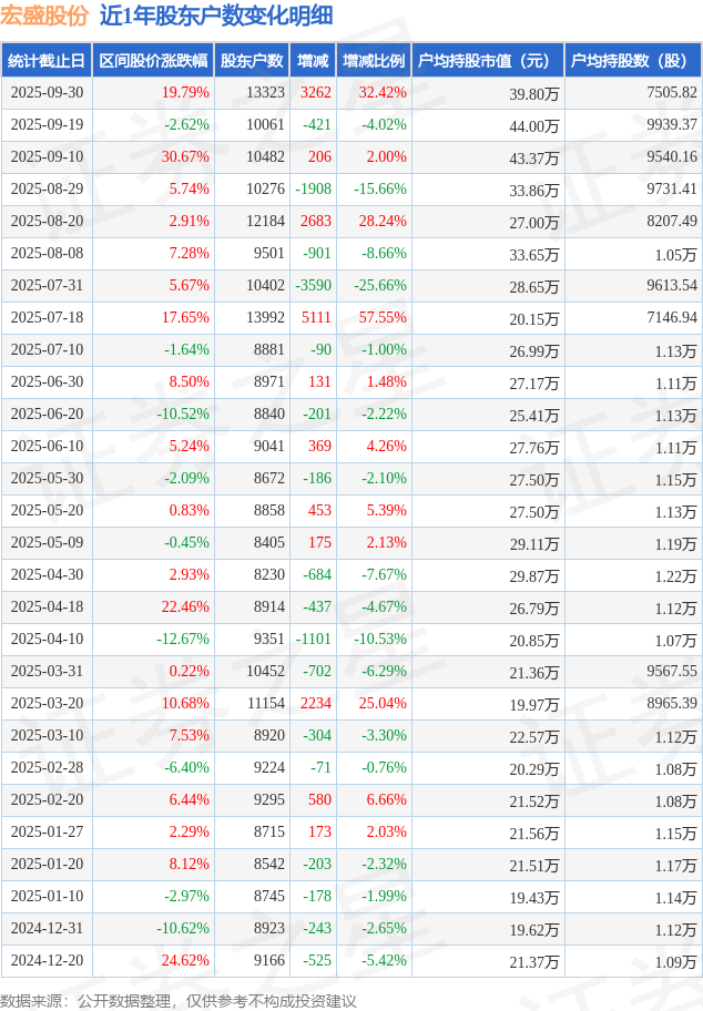 从股价来看,2025年9月19日至2025年9月30日,宏盛股份区间涨幅为19.79%,在此期间股东户数增加3262.0户,增幅为32.42%。