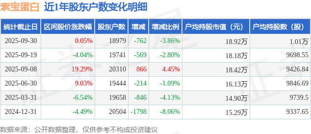 从股价来看,2025年9月19日至2025年9月30日,索宝蛋白区间涨幅为0.05%,在此期间股东户数减少762.0户,减幅为3.86%。