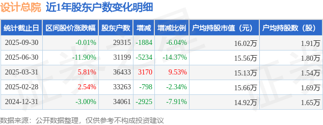 证券之星消息,近日设计总院披露,截至2025年9月30日公司股东户数为2.93万户,较6月30日减少1884.0户,减幅为6.04%。户均持股数量由上期的1.8万股增加至1.91万股,户均持股市值为16.02万元。
