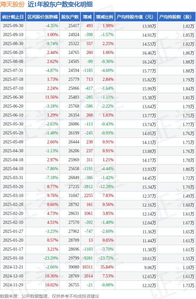 从股价来看,2025年9月10日至2025年9月30日,海天股份区间跌幅为4.35%,在此期间股东户数增加493.0户,增幅为1.98%。