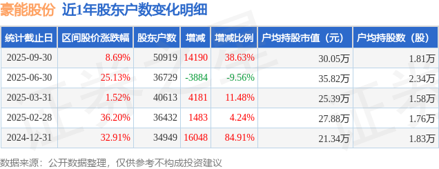 证券之星消息,近日豪能股份披露,截至2025年9月30日公司股东户数为5.09万户,较6月30日增加1.42万户,增幅为38.63%。户均持股数量由上期的2.34万股减少至1.81万股,户均持股市值为30.05万元。