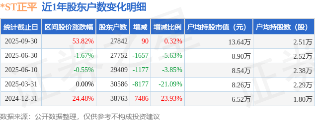 从股价来看,2025年6月30日至2025年9月30日,*ST正平区间涨幅为53.82%,在此期间股东户数增加90.0户,增幅为0.32%。