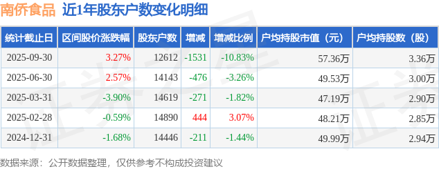 从股价来看,2025年6月30日至2025年9月30日,南侨食品区间涨幅为3.27%,在此期间股东户数减少1531.0户,减幅为10.83%。