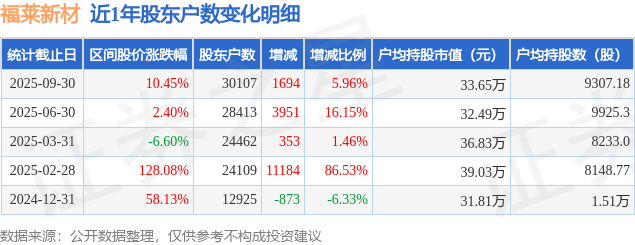 从股价来看,2025年6月30日至2025年9月30日,福莱新材区间涨幅为10.45%,在此期间股东户数增加1694.0户,增幅为5.96%。