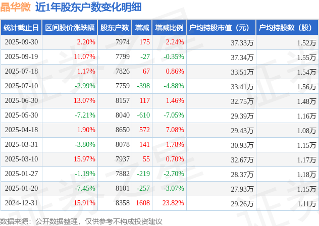 证券之星消息,近日晶华微披露,截至2025年9月30日公司股东户数为7974.0户,较9月19日增加175.0户,增幅为2.24%。户均持股数量由上期的1.55万股减少至1.52万股,户均持股市值为37.33万元。
