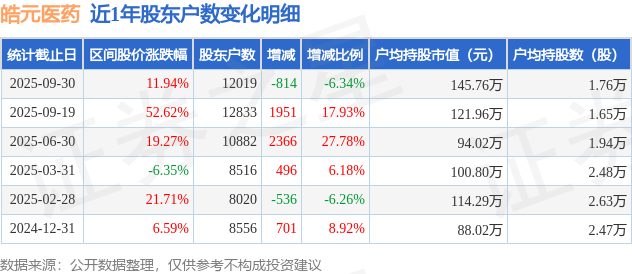 从股价来看,2025年9月19日至2025年9月30日,皓元医药区间涨幅为11.94%,在此期间股东户数减少814.0户,减幅为6.34%。
