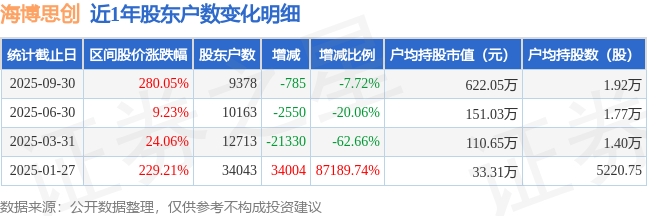 从股价来看,2025年6月30日至2025年9月30日,海博思创区间涨幅为280.05%,在此期间股东户数减少785.0户,减幅为7.72%。