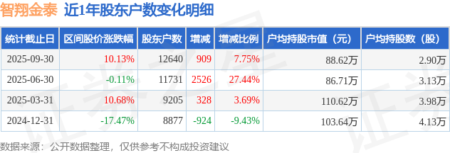 从股价来看,2025年6月30日至2025年9月30日,智翔金泰区间涨幅为10.13%,在此期间股东户数增加909.0户,增幅为7.75%。