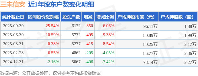 证券之星消息,近日三未信安披露,截至2025年9月30日公司股东户数为6122.0户,较6月30日增加350.0户,增幅为6.06%。户均持股数量由上期的1.99万股减少至1.88万股,户均持股市值为96.11万元。